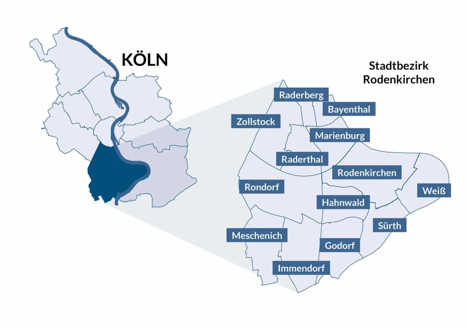 Wir sind in ganz Köln als Immobilienmakler für Sie da – von der Südstadt bis in den Kölner Norden und in allen Veedeln: Köln-Lindenthal, Köln-Weiden, Köln-Junkersdorf, Köln-Altstadt, Köln-Mülheim, Köln-Kalk, Köln-Deutz, Köln-Porz, Köln-Nippes, Köln-Rodenkirchen, Köln-Ehrenfeld.